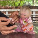 And eventually, when he felt more secure, he reached for her with soft hands again. His mother took that moment and gently covered one tiny hand — this time he didn’t fight as strongly. He looked up at her, still pouting, but calmer.