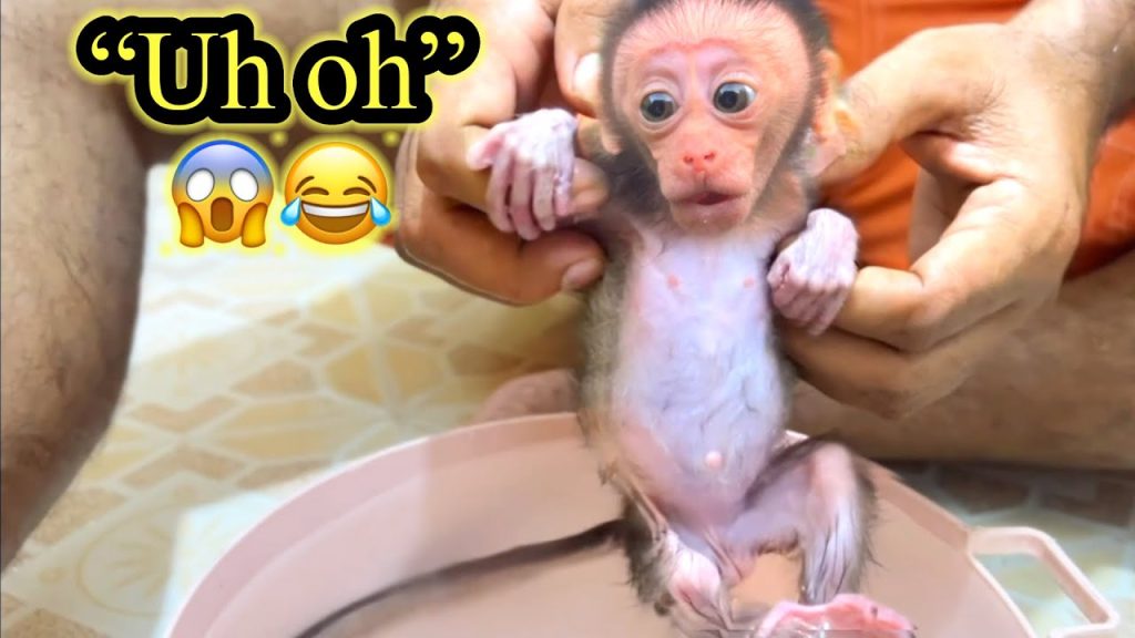 Baby monkey Mimi never expected her ordinary bath time to suddenly transform into a storm of emotion, tension, splashing panic, and full-body confusion. Bath time in human imagination looks cute — tiny bubbles, gentle water, soft towel afterwards — but for a very young primate, especially one without stable sensory confidence, water can instantly convert from curiosity into danger. Mimi’s reaction — the wide eyes, the frozen chest, then the sudden flailing scramble — shows clearly that her nervous system was not ready for the transition between dry security and slippery unpredictability. Small monkeys do not yet have the internal framework to understand “this water is safe.” Their brains interpret sudden temperature change, shifting surface, and loss of footing as threat. So when Mimi realized the bath was not simply gentle touching but full wet involvement, the fear snapped open.