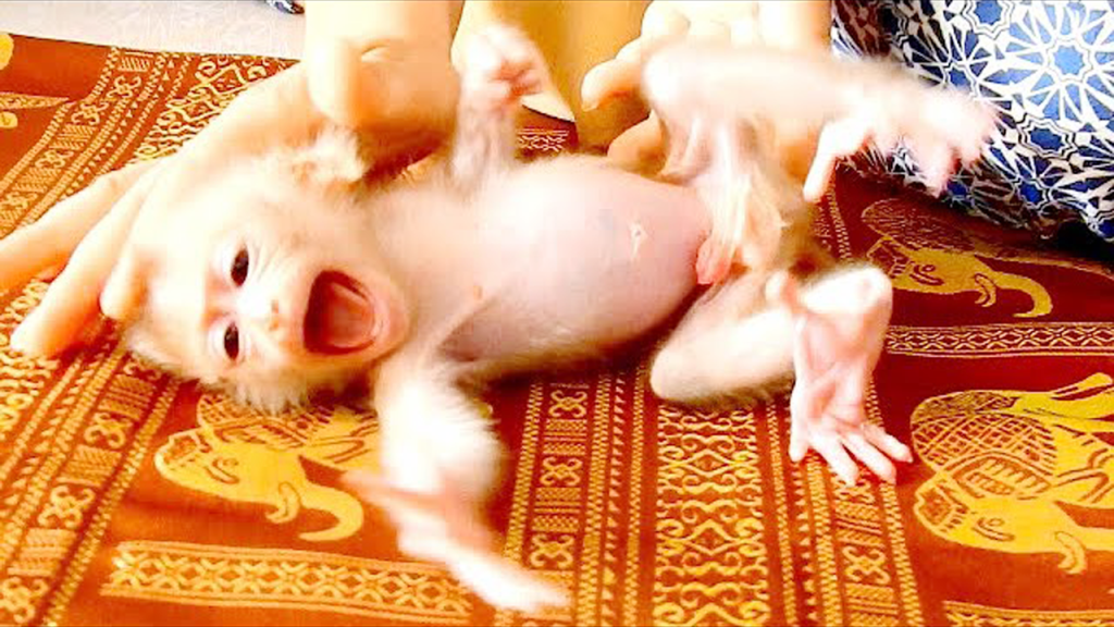 Newborn monkey Dody is still learning how to understand the world, and like many infants—human or animal—he reacts intensely to even the smallest frustrations. In this moment, his mother tries to help him by putting on his diaper, but Dody is too impatient to wait. His reaction comes in the form of crying, shaking with excitement or mild seizure-like movements common to distressed newborns, and even expressing what looks like anger. Though dramatic, this behavior is typical of young primates who lack control over their emotions and bodies.