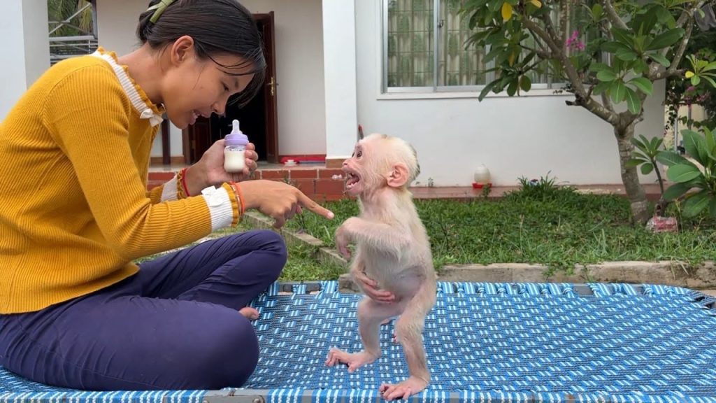 Once Minea finally takes the milk, she settles almost instantly. Her body relaxes, her breathing slows, and her earlier anger dissolves as warmth and fullness replace discomfort. This rapid shift highlights how quickly baby monkeys move between emotions—especially when tired or hungry. The chaos, though noisy, is a normal part of growing up.