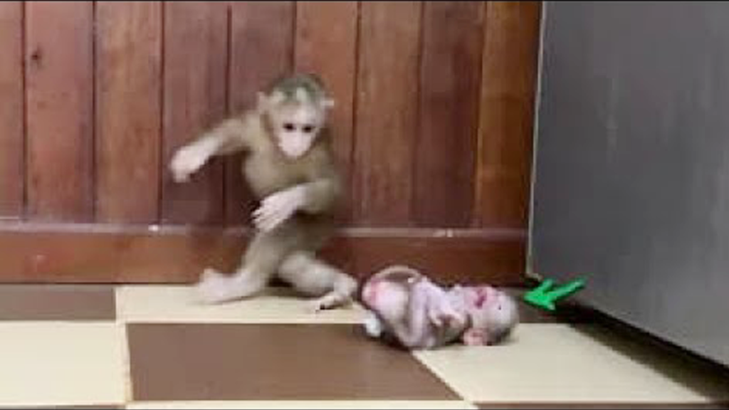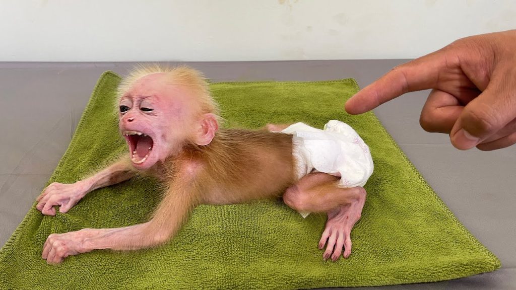 The newborn baby monkey lies on the floor, tiny body curled inward, eyes wet, chest shivering with the sharp rhythm of a baby who does…