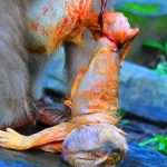 In a quiet corner of the forest edge, where the tall trees sway and dappled sunlight dances on the ground, a tiny newborn monkey nestles…